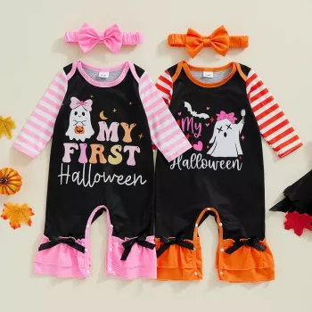 Pumpkin Print Long Sleeve Jumpsuit and Bow Headband set